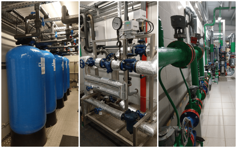 исходная вода → грубая фильтрация на дисковых фильтрах → контактная коагуляция на механических фильтрах → двухступенчатое умягчение на Na-катионитных фильтрах → химочищенная вода.
